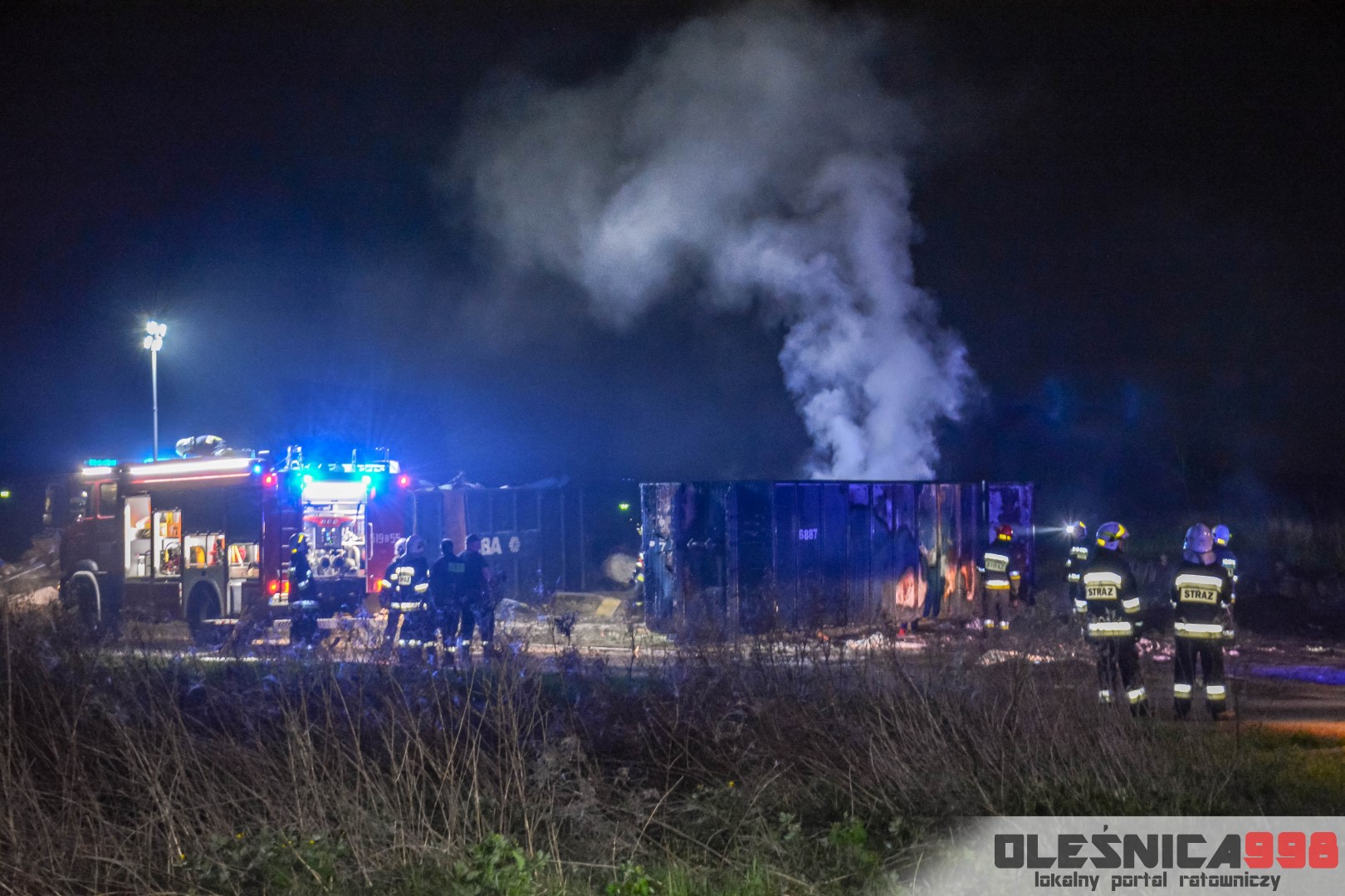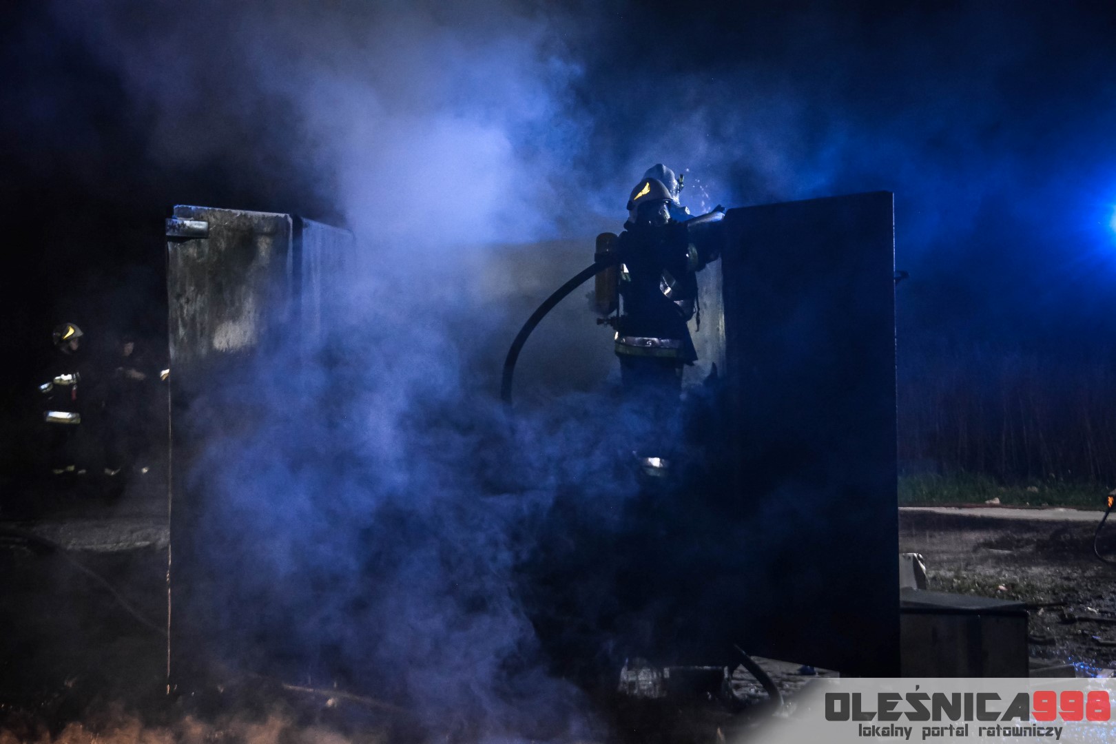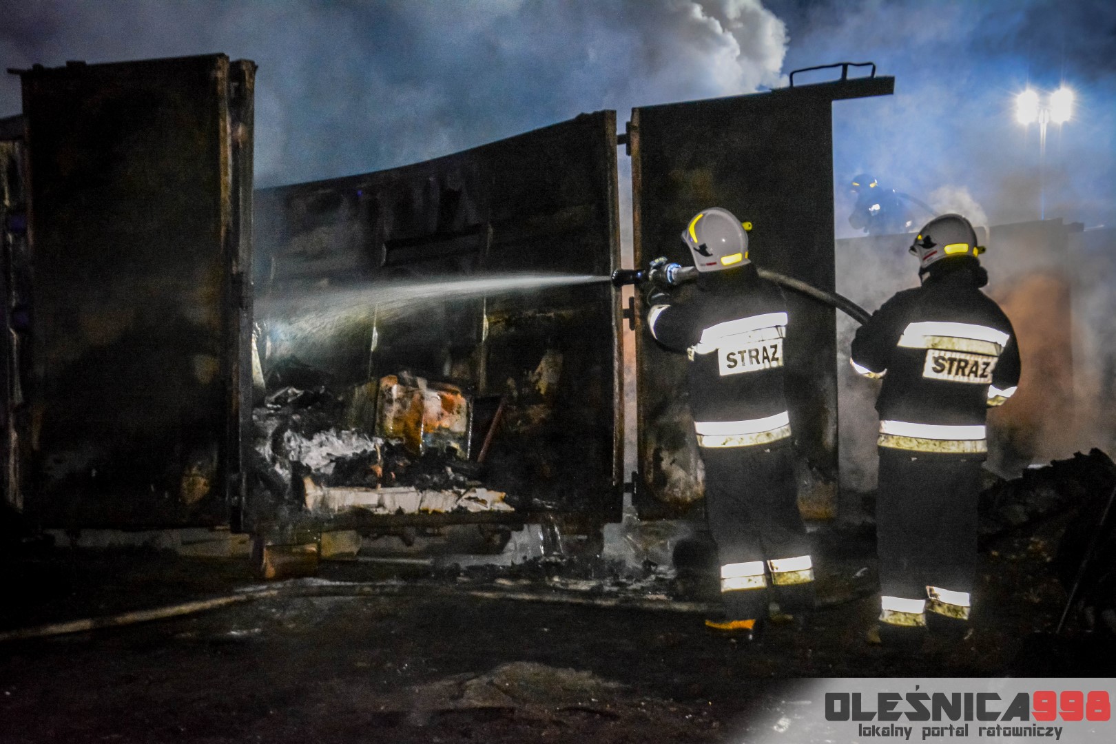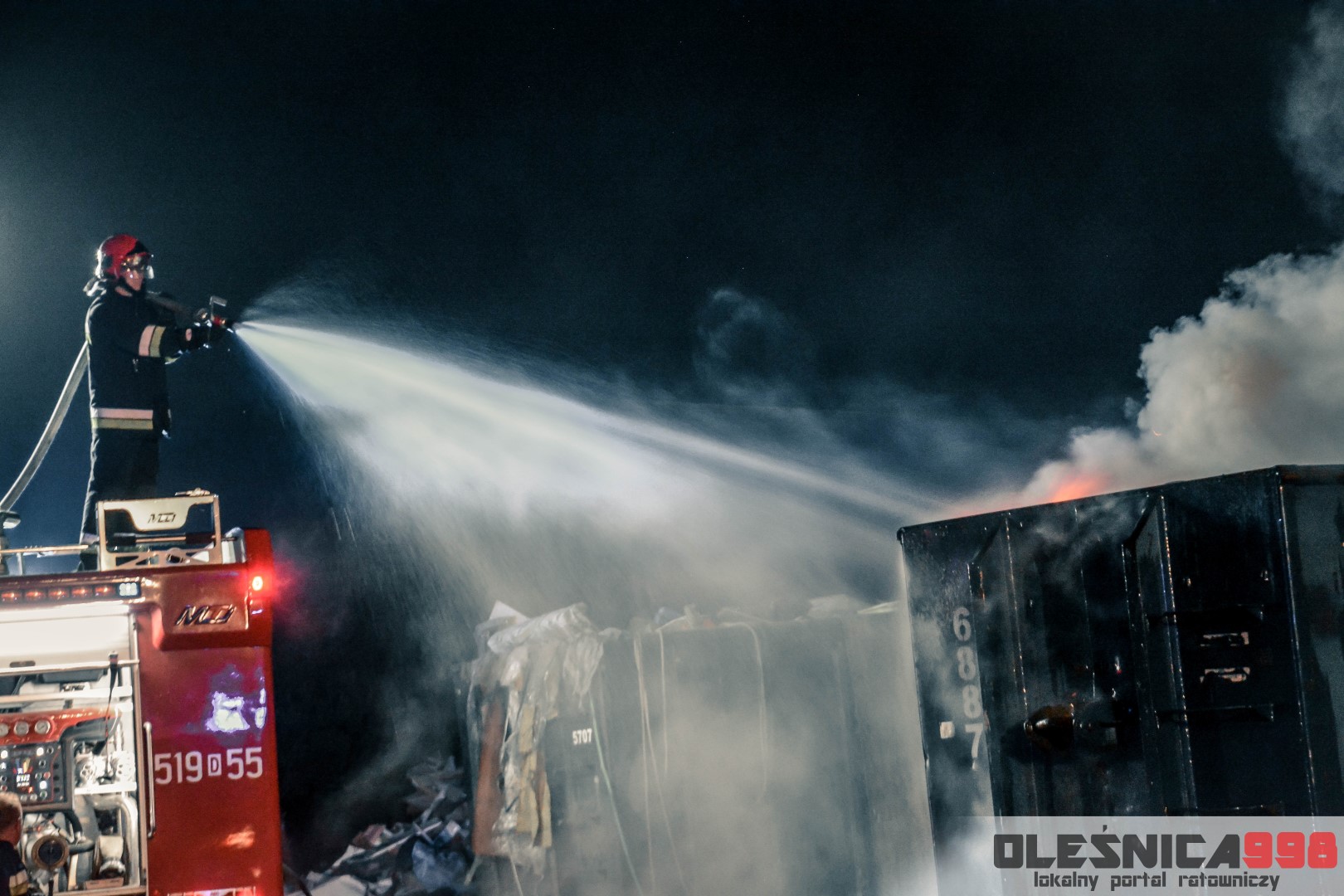 Strażacy po dojeździe na miejsce domniemanego wypalania trawy zastali mocno rozwinięty pożar składowiska śmieci. Ogniem objęte były dwa kontenery, a także zalegające na ziemi hałdy odpadów. Dowódca obecnego na miejscu zastępu polecił Dyżurnej Stanowiska Kierowania, zadysponowanie na miejsce dodatkowych sił i środków.