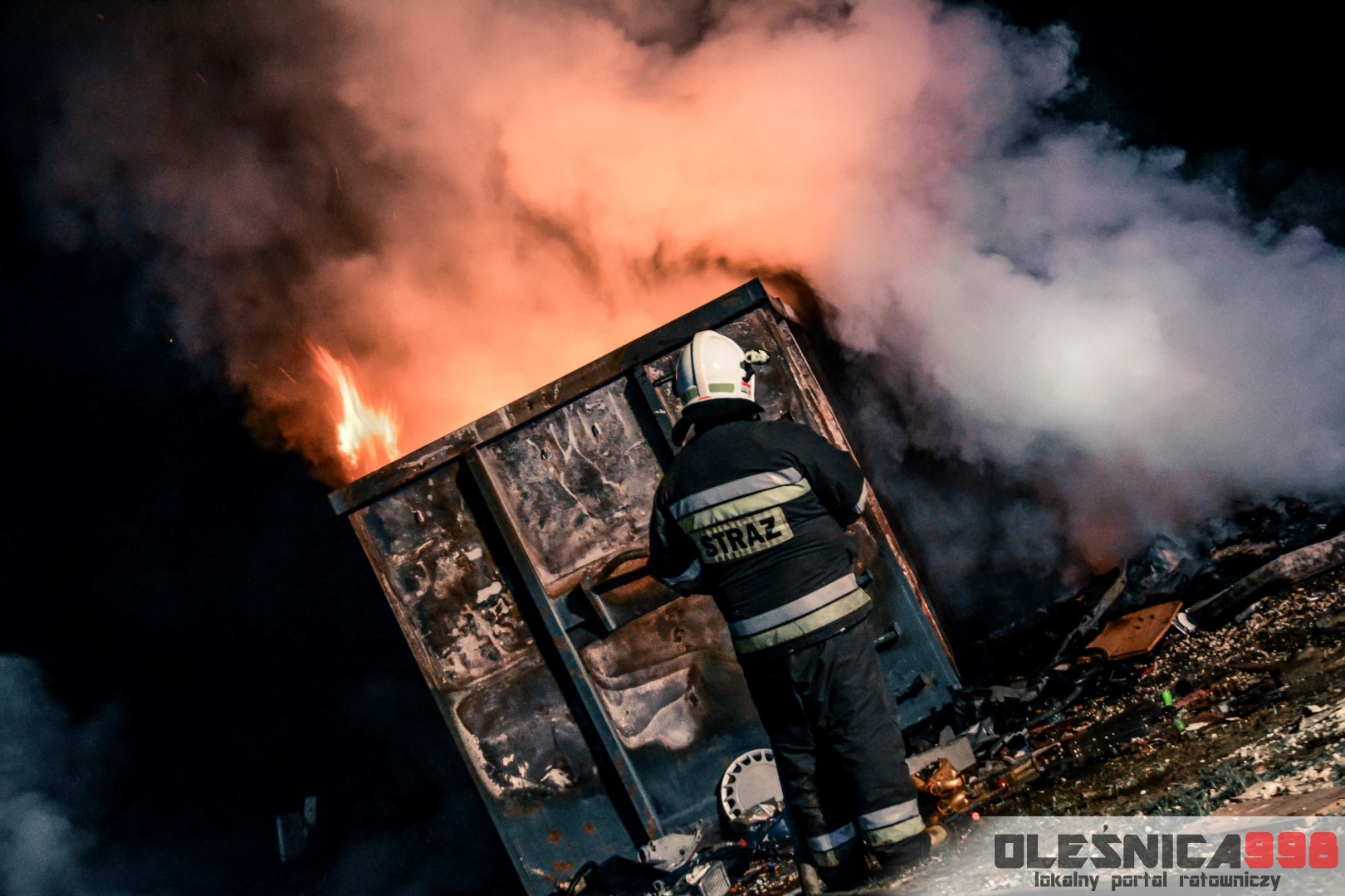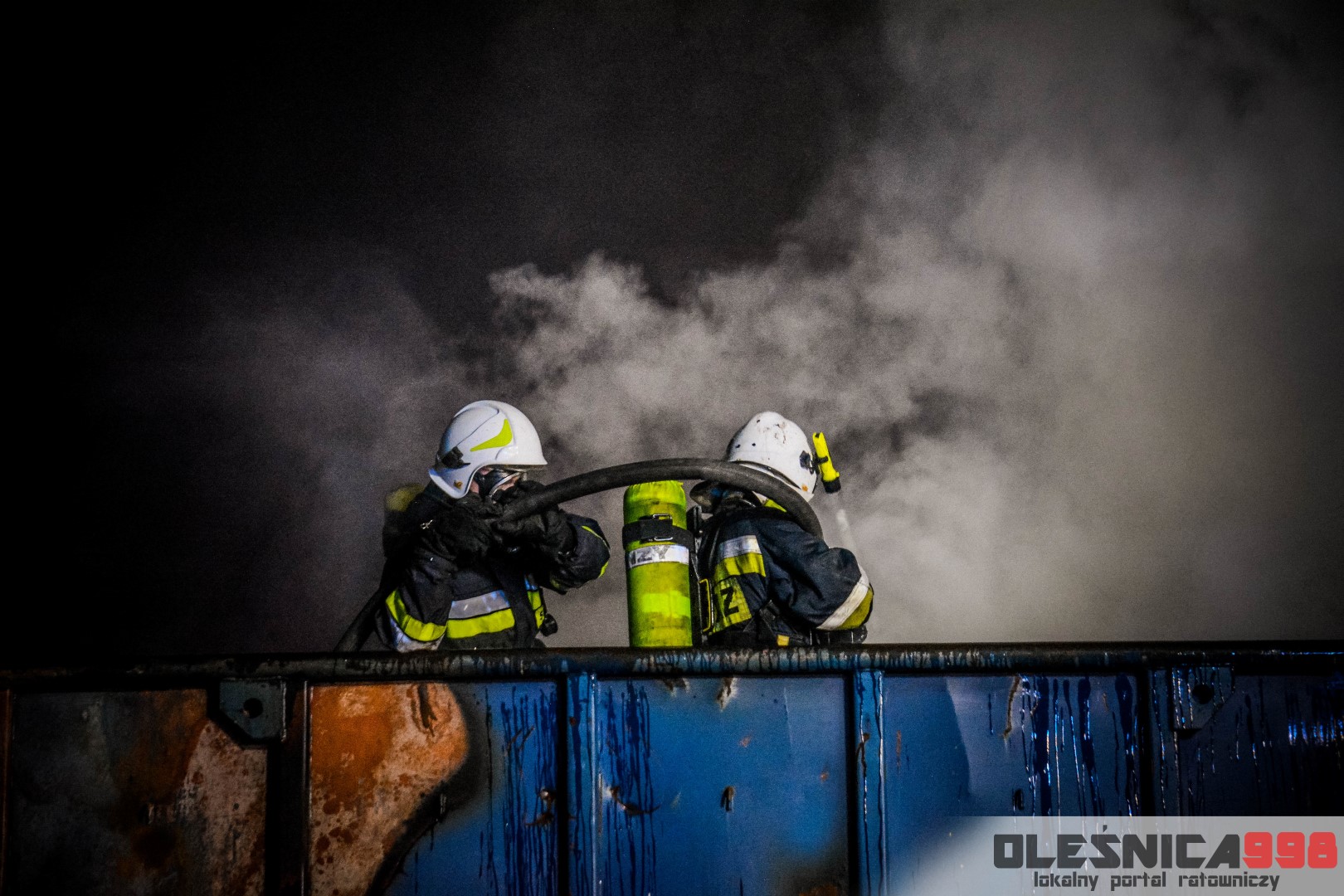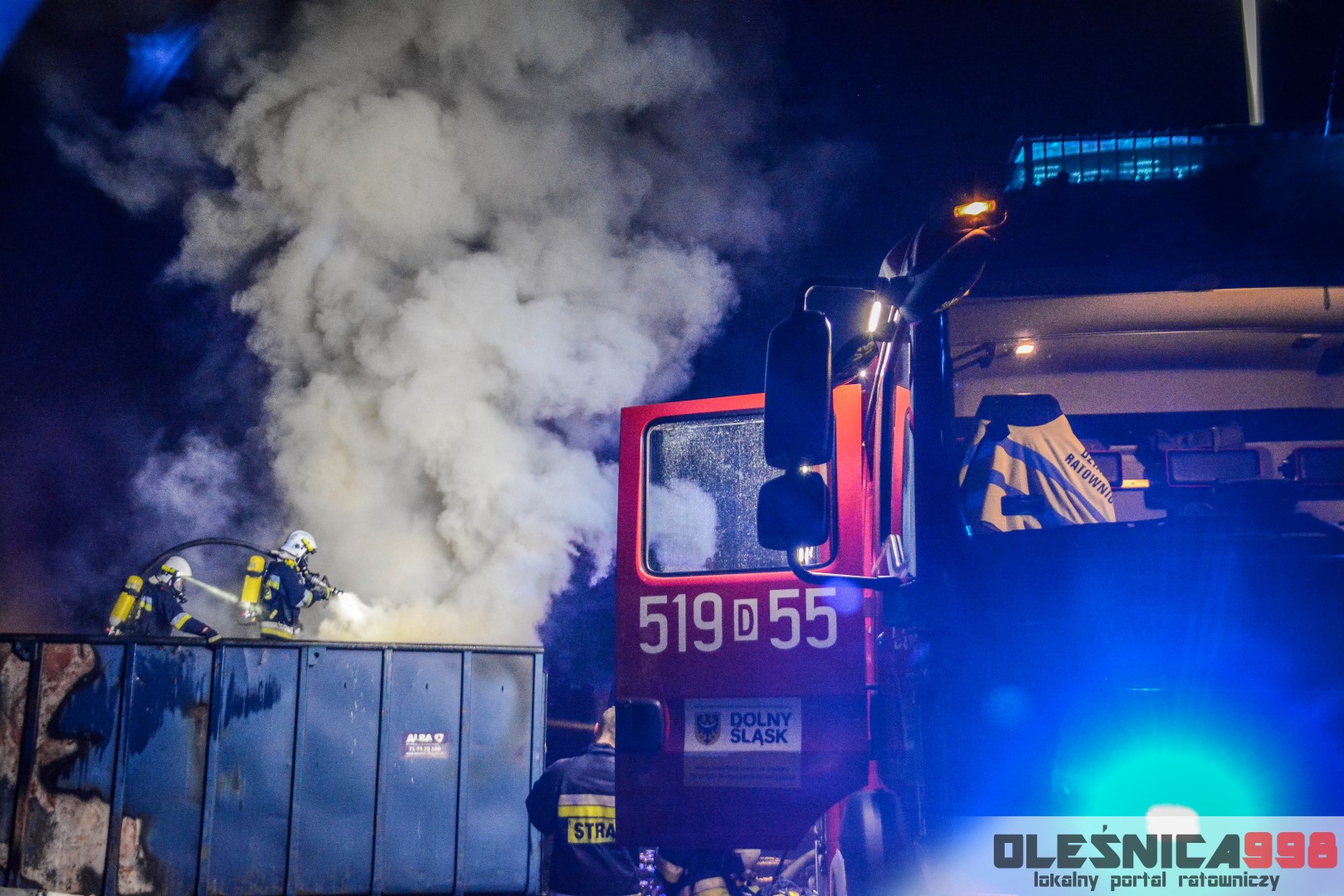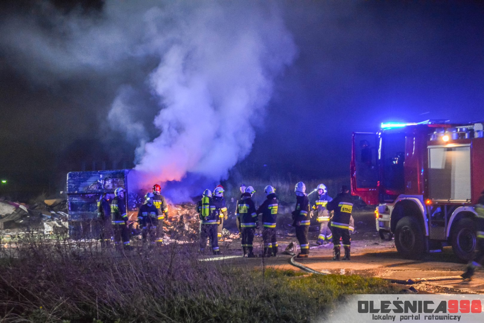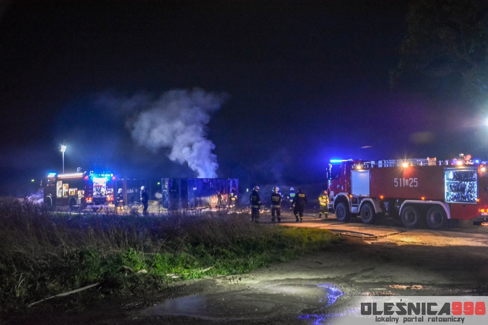 Strażacy po dojeździe na miejsce domniemanego wypalania trawy zastali mocno rozwinięty pożar składowiska śmieci. Ogniem objęte były dwa kontenery, a także zalegające na ziemi hałdy odpadów. Dowódca obecnego na miejscu zastępu polecił Dyżurnej Stanowiska Kierowania, zadysponowanie na miejsce dodatkowych sił i środków.