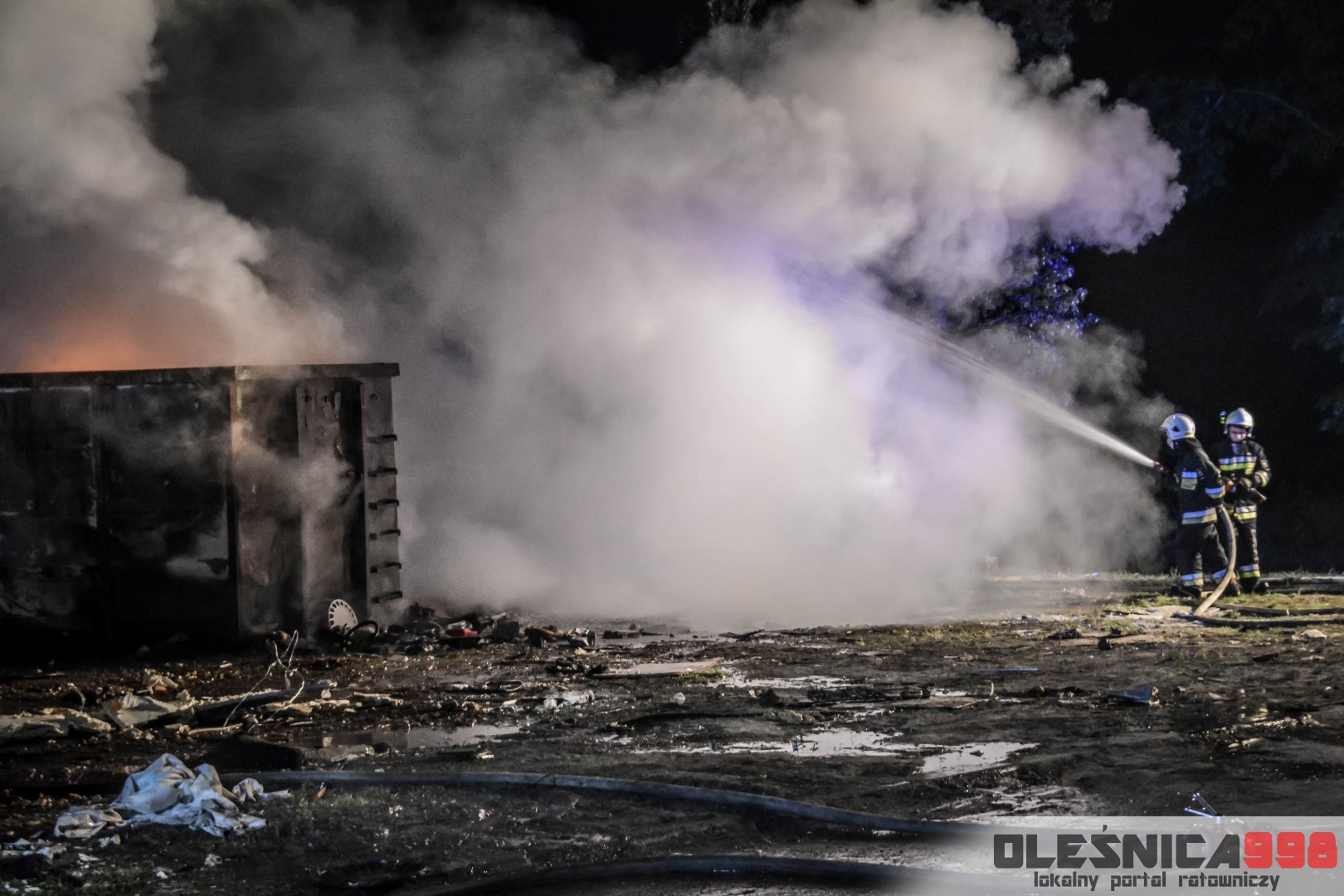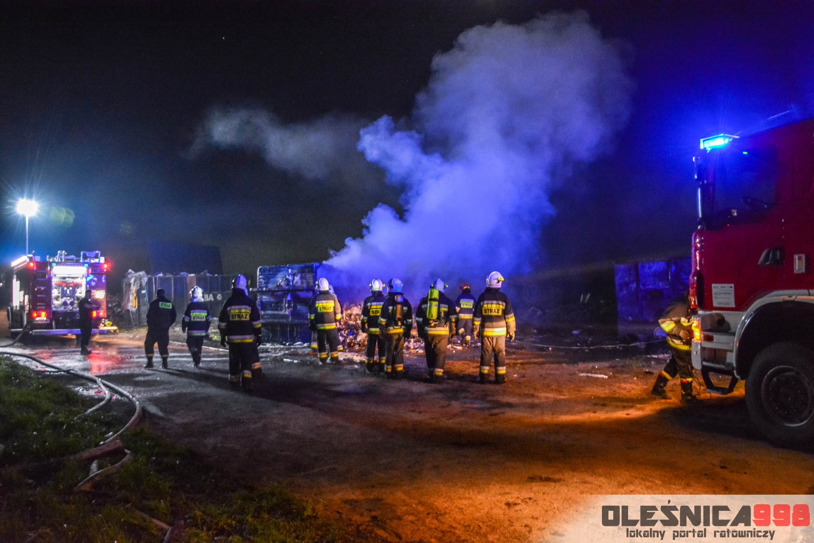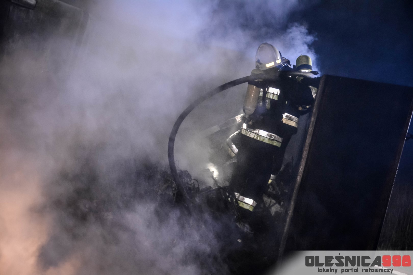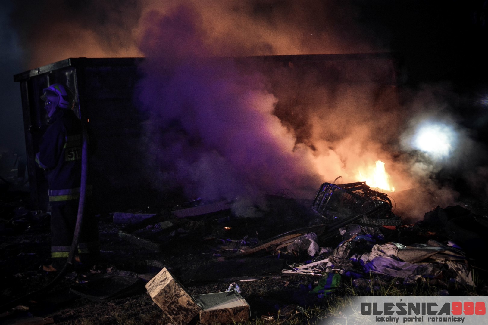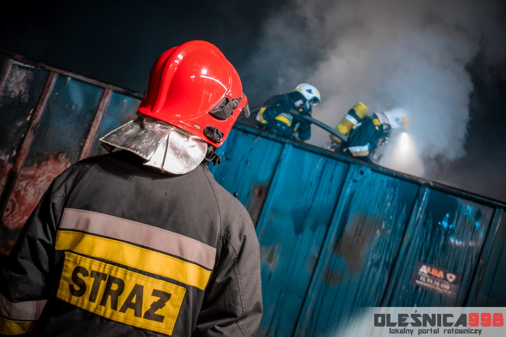 Strażacy po dojeździe na miejsce domniemanego wypalania trawy zastali mocno rozwinięty pożar składowiska śmieci. Ogniem objęte były dwa kontenery, a także zalegające na ziemi hałdy odpadów. Dowódca obecnego na miejscu zastępu polecił Dyżurnej Stanowiska Kierowania, zadysponowanie na miejsce dodatkowych sił i środków.