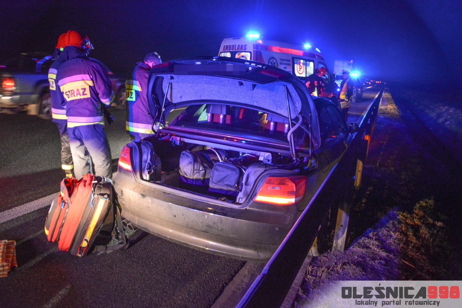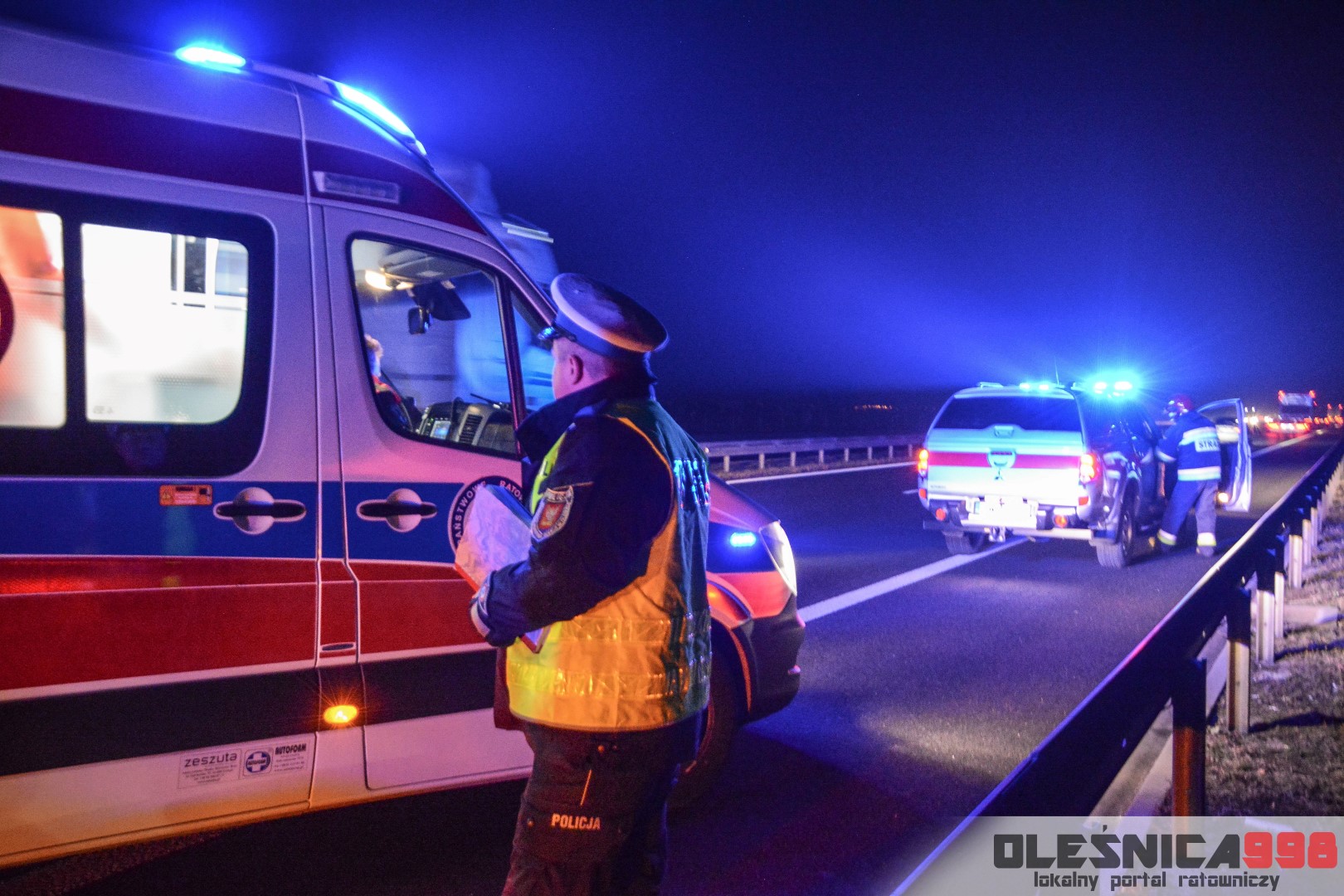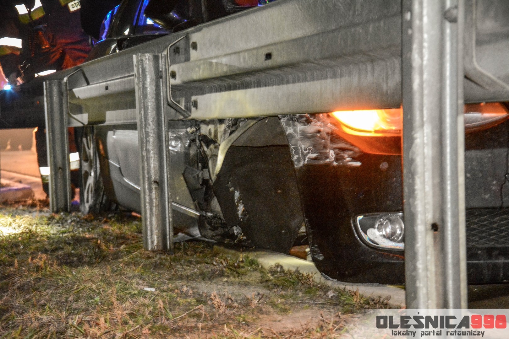 Dziś, około godziny 17:40, do SK KP PSP w Oleśnicy wpłynęło zgłoszenie o zdarzeniu drogowym na 47 kilometrze drogi ekspresowej nr 8. Z przekazanych informacji wynikało, że samochód osobowy uderzył w bariery energochłonne a jedna osoba, nim podróżująca, jest poszkodowana. Na miejsce niezwłocznie udały się dwa zastępy z JRG Oleśnica. Zadysponowane zostały również pozostałe służby – Policja a także Pogotowie Ratunkowe.