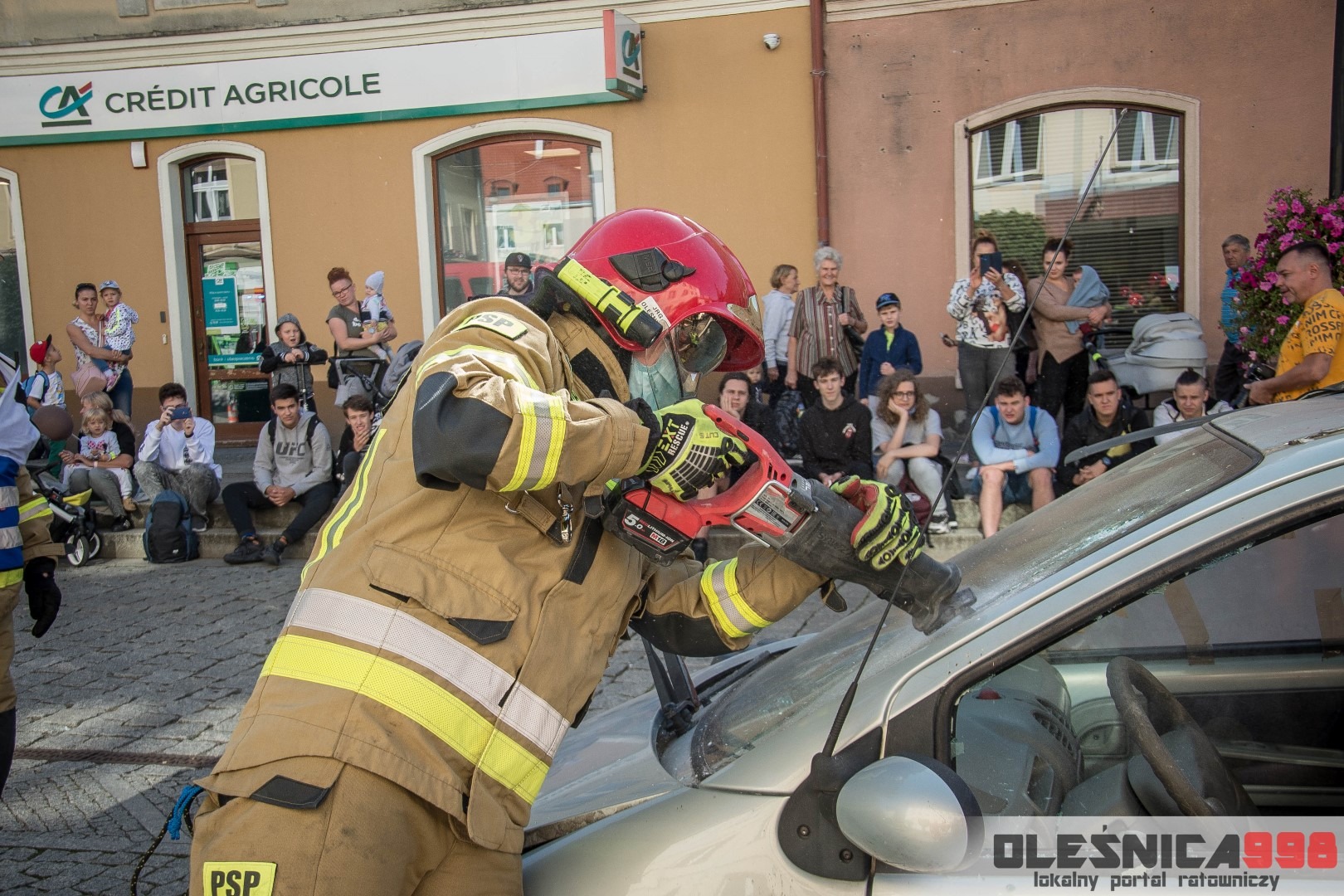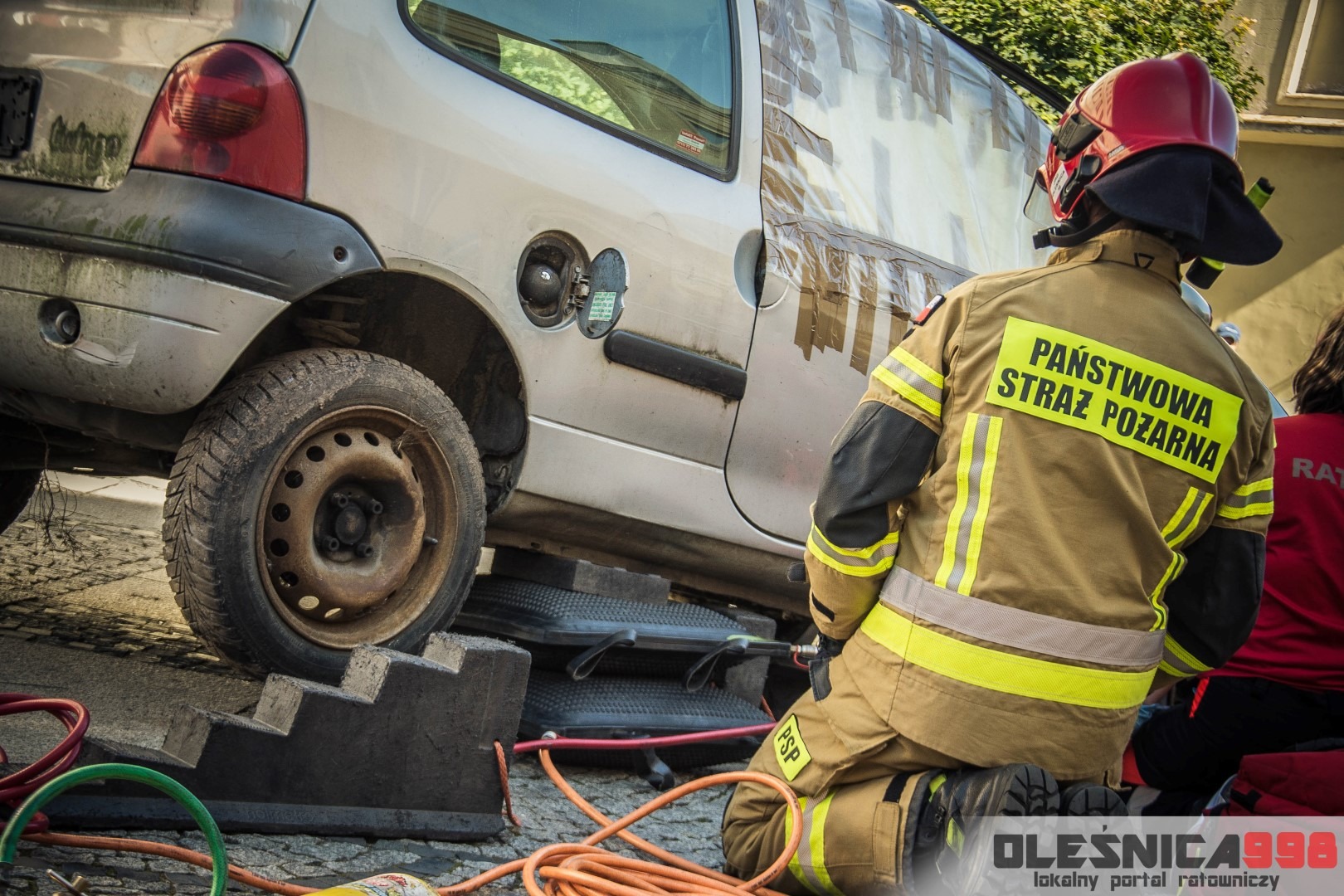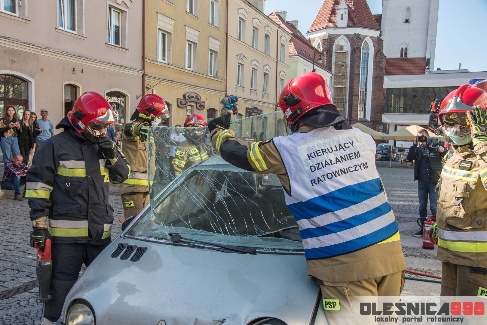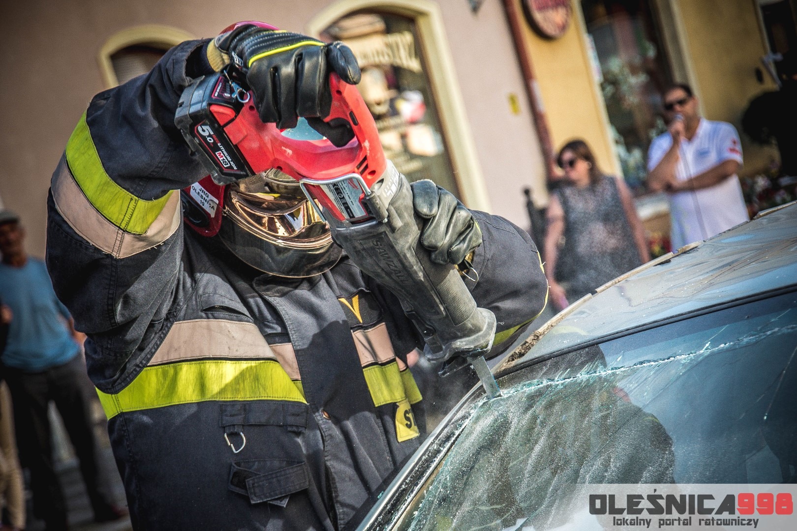 Dziś na płycie oleśnickiego Rynku, w ramach ogólnopolskiej akcji pod nazwą „Wizja Zero” przeprowadzona została symulowana akcja ratownicza podczas pozorowanego wypadku komunikacyjnego. Pokaz miał na celu zobrazowanie współpracy służb ratowniczych na miejscu zdarzenia a także podnoszenie świadomości na temat przyczyn i skutków zdarzeń drogowych. Zrealizowany scenariusz zakładał potrącenie rowerzysty przez nietrzeźwego kierującego samochodem osobowym. Następnie Strażacy zaprezentowali techniki wykonywania dostępu do osób uwięzionych w pojazdach, przy użyciu narzędzi hydraulicznych. W działaniach wzięły udział zastępy Straży Pożarnej z JRG Oleśnica, Policjanci z Wydziału Ruchu Drogowego oleśnickiej Komendy, a także wolontariusze stowarzyszenia Służby Ratownicze.
