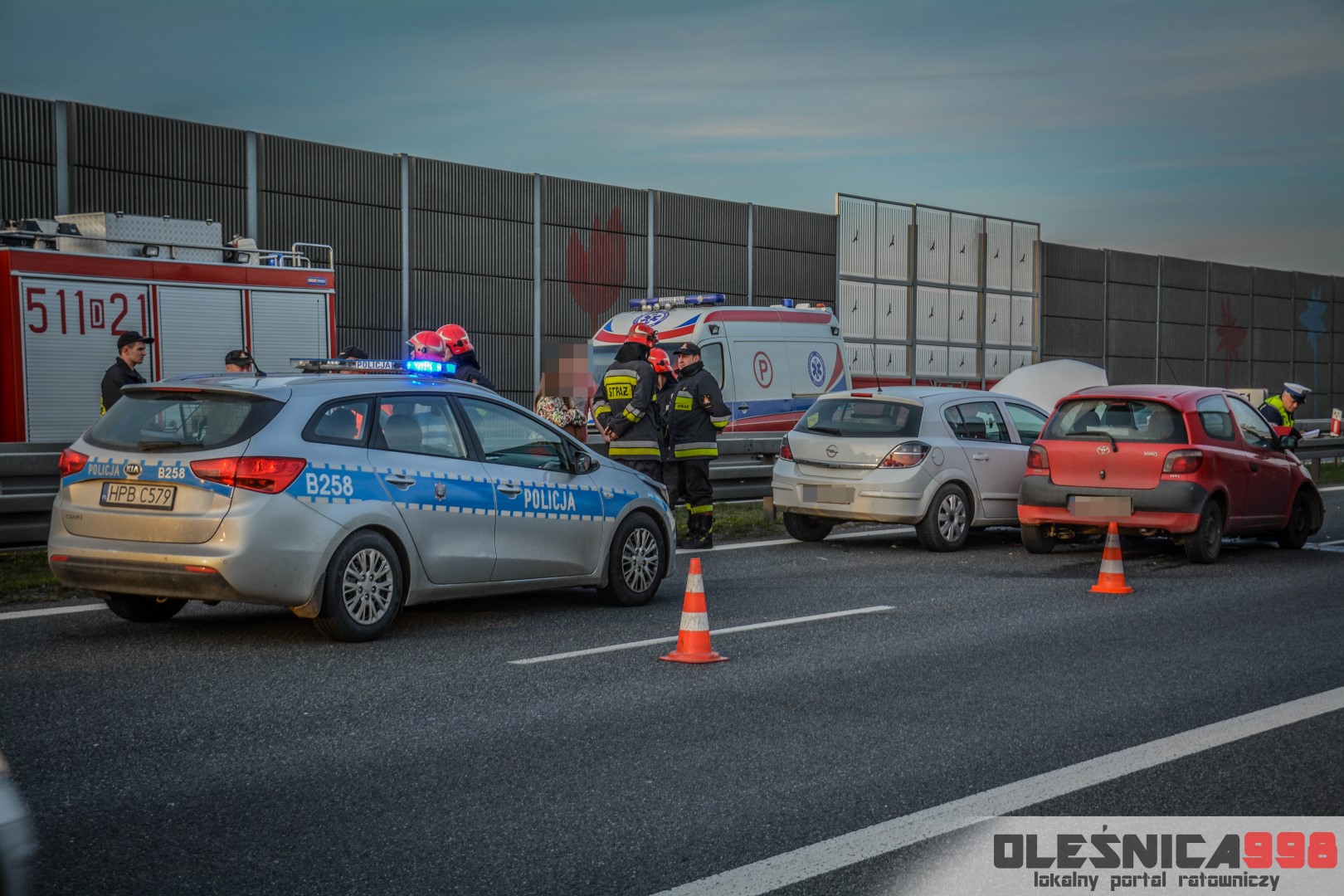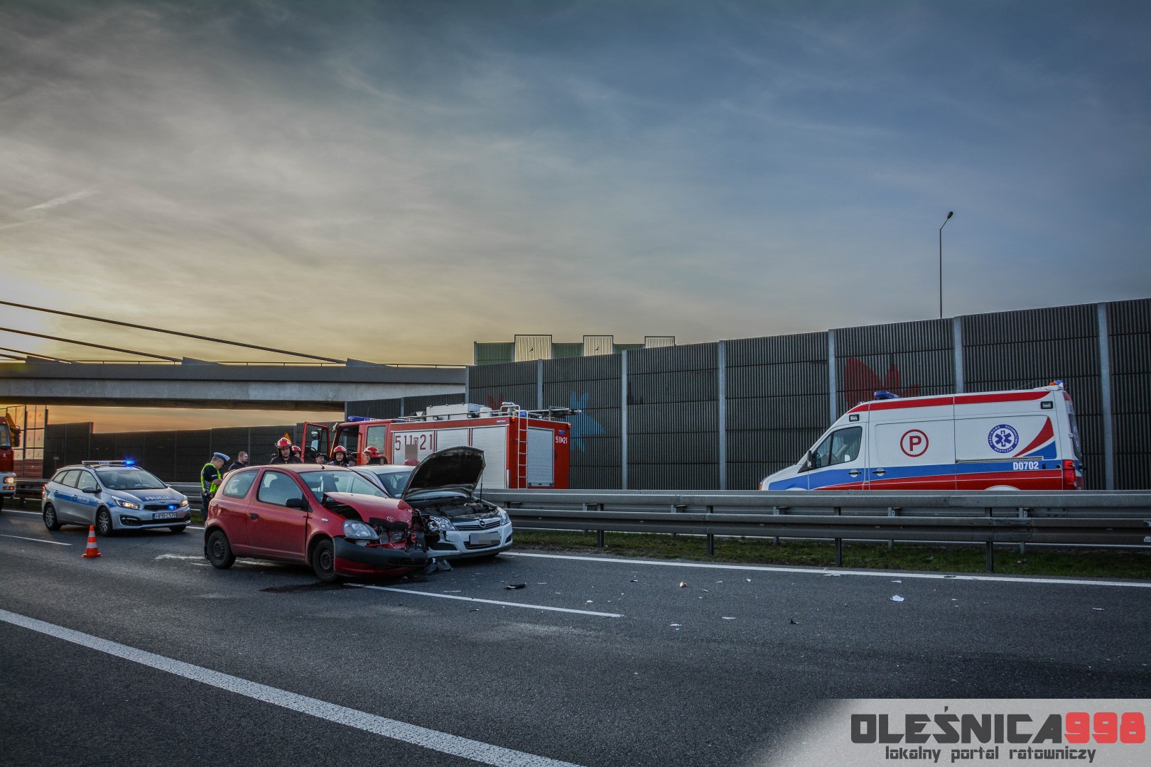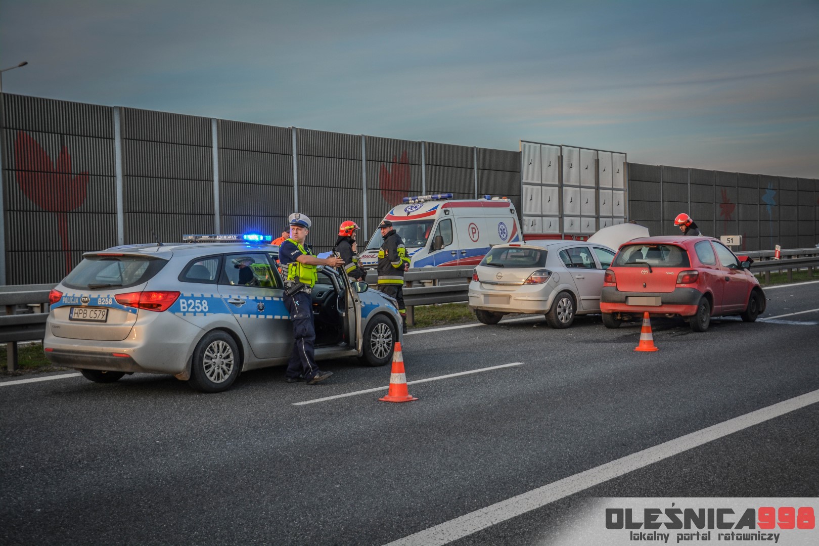 Około godziny 18:20, na trasie S8, tuż przed węzłem Oleśnica Zachód doszło do kolejnego dziś zdarzenia drogowego. Zderzyły się tam osobowa Toyota Yaris i Opel Astra. Na miejscu zjawiły się dwa zastępy Strażaków, podstawowa karetka Pogotowia Ratunkowego oraz patrol Policji.