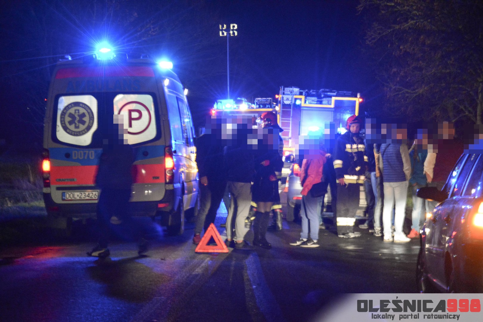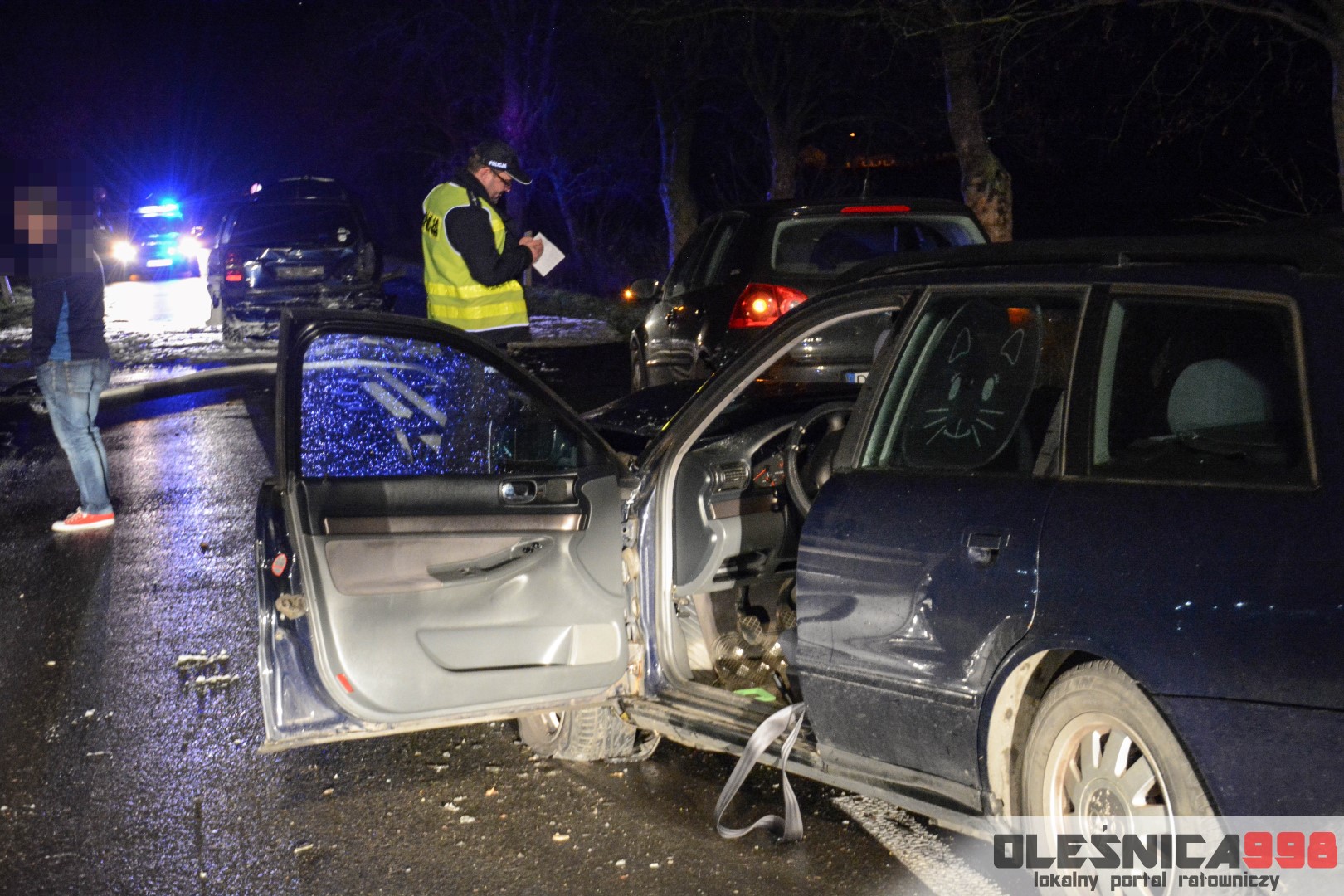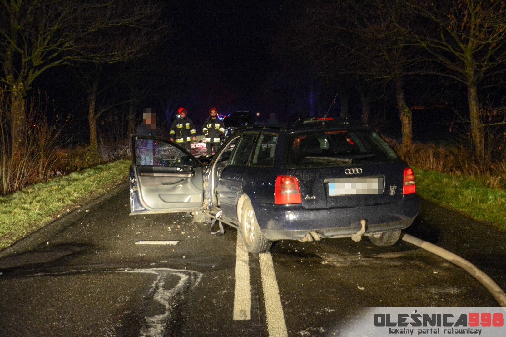 Jak udało nam się ustalić, kierujący pojazdem marki Audi A4, najprawdopodobniej nie dostosował prędkości oraz odstępu od poprzedzającego pojazdu, w wyniku czego „otarł się” o Volkswagena Golfa a następnie z dużą siłą najechał na tył Opla Zafiry. Droga w miejscu wypadku jest wciąż zablokowana w obu kierunkach. Dwaj poszkodowani trafili już do szpitala. Trwa ustalanie dokładnych okoliczności zdarzenia. Na miejscu działania wciąż prowadzą dwa zastępy oleśnickich Strażaków. Trwa zabezpieczanie oraz oświetlanie terenu akcji.