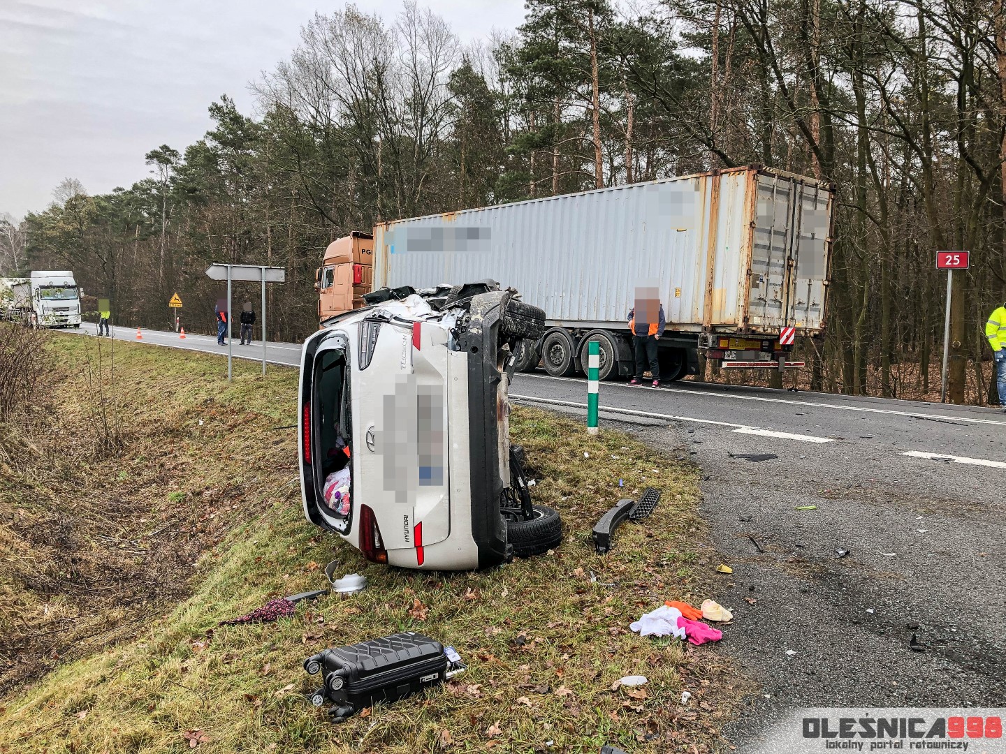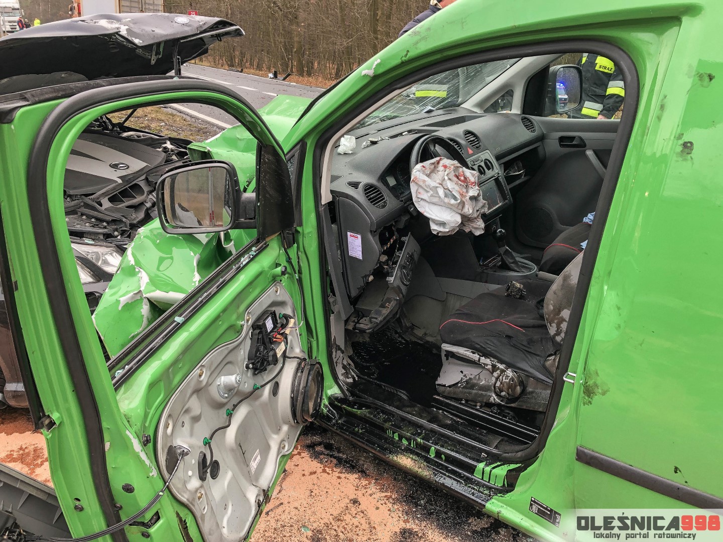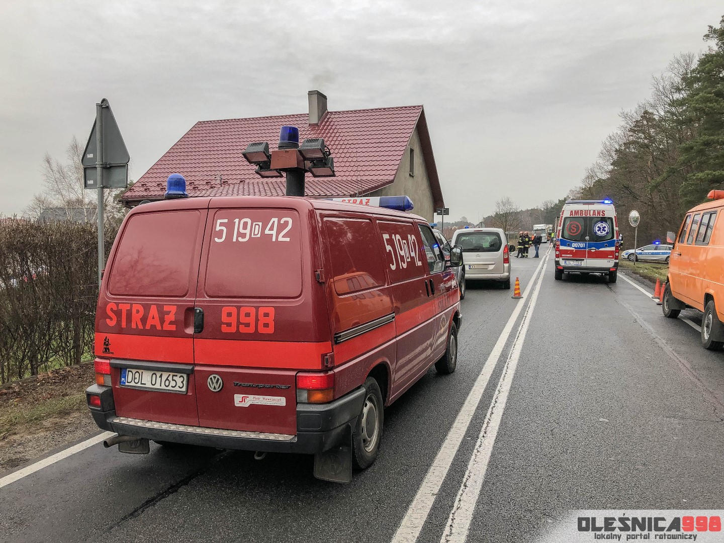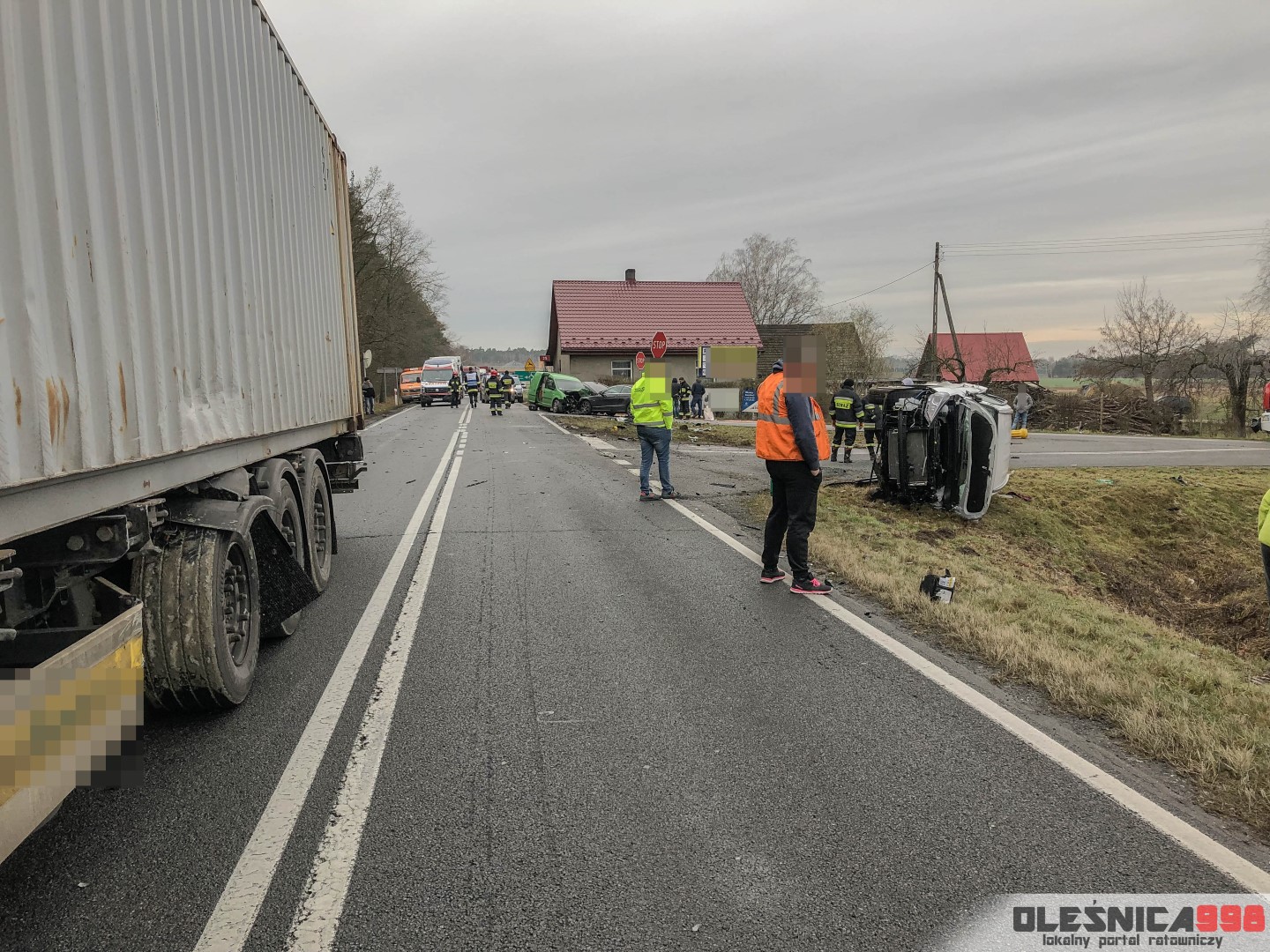 Po dotarciu pierwszych zastępów na miejsce wypadku i rozpoznaniu. stwierdzono, że w zdarzeniu udział biorą łącznie cztery pojazdy – trzy osobowe i jeden ciężarowy. Jeden z samochodów znajdował się na boku, na skarpie przydrożnego rowu. Łącznie ranne zostały dwie osoby. Kierowca Volkswagena doznał najpoważniejszych obrażeń i po udzieleniu pomocy na miejscu został przetransportowany przez śmigłowiec Pogotowia Lotniczego do jednego z wrocławskich szpitali. Jak udało nam się ustalić, miał między innymi pękniętą śledzionę a także poważne złamanie podudzia.