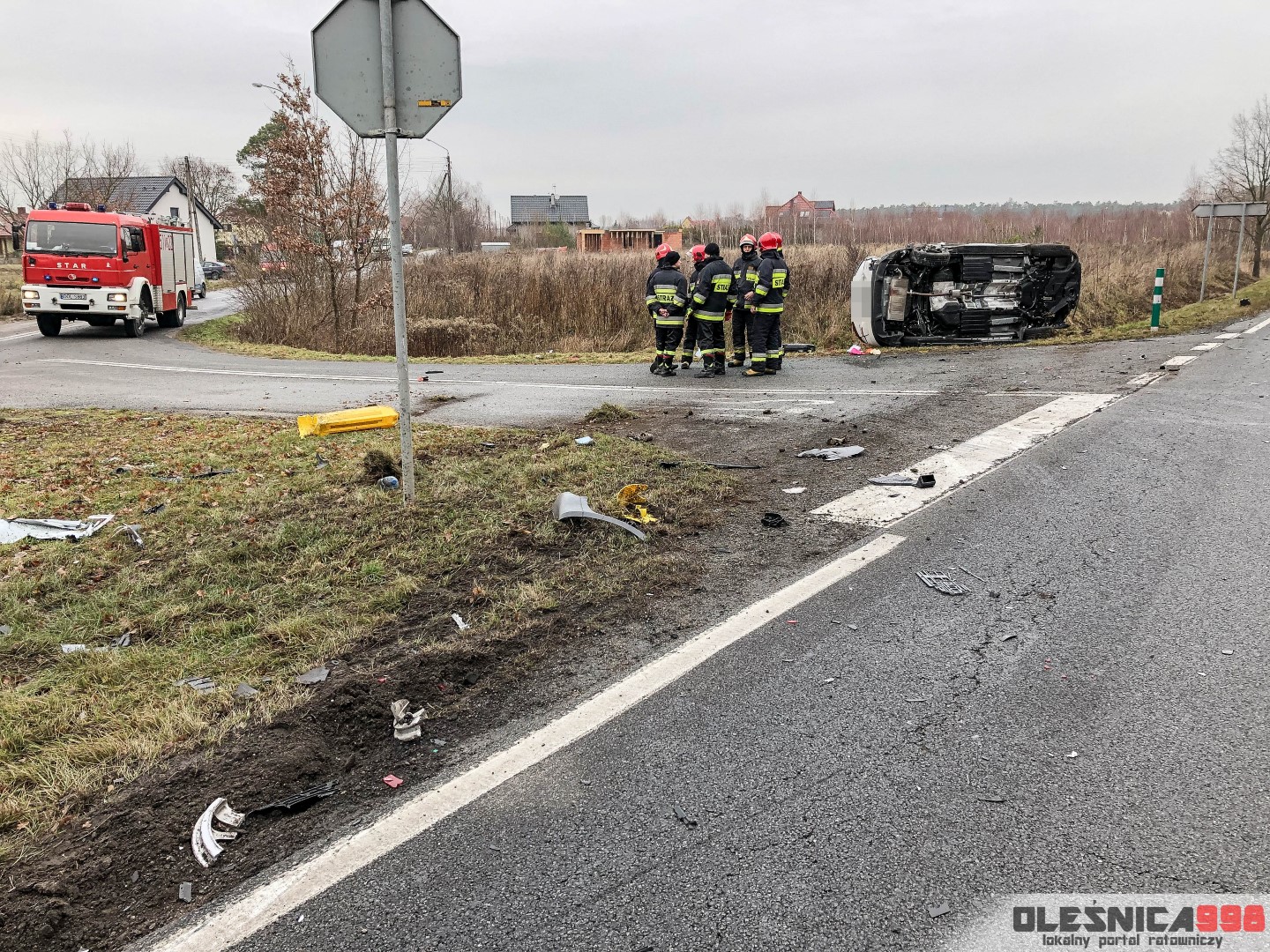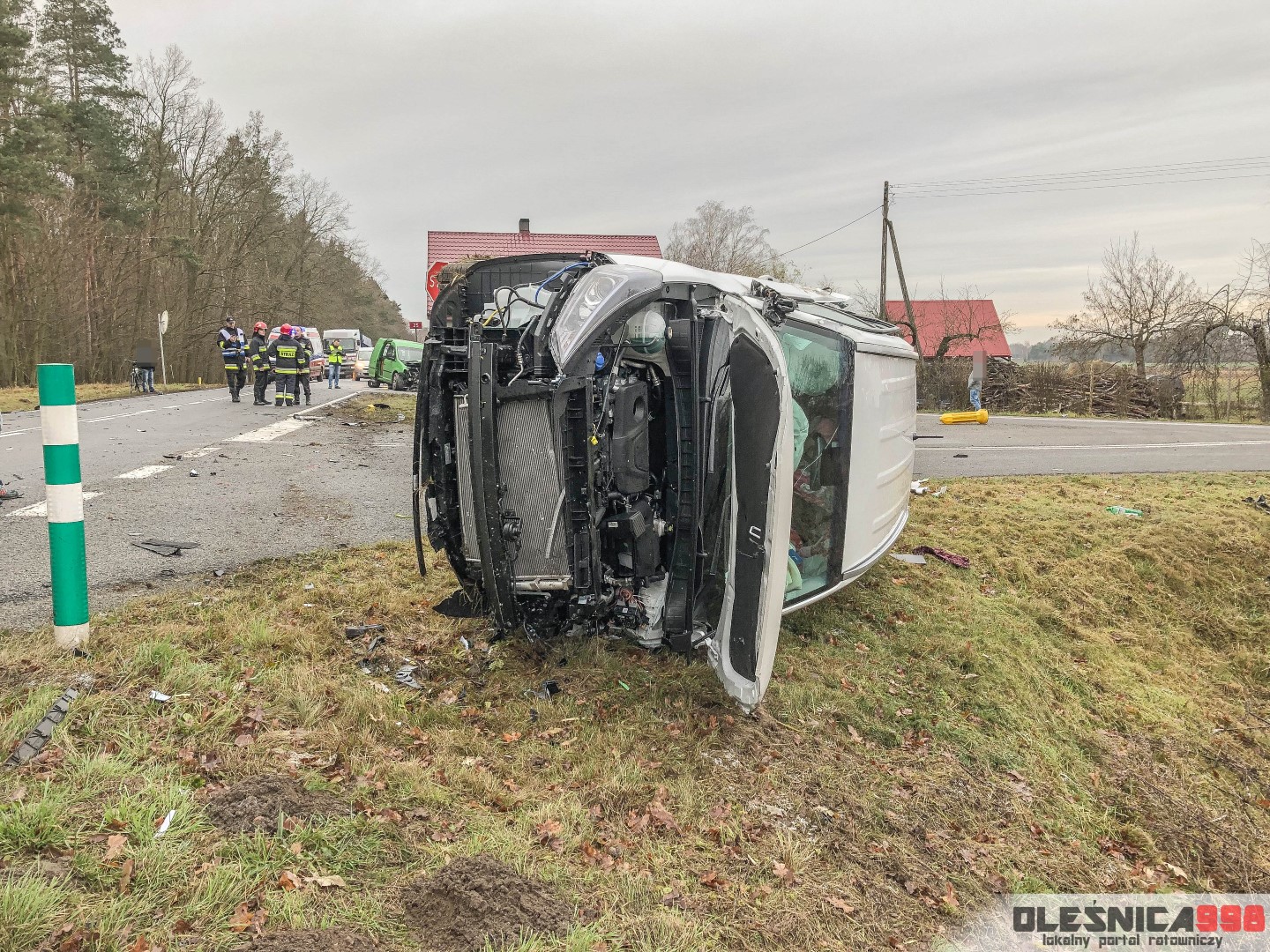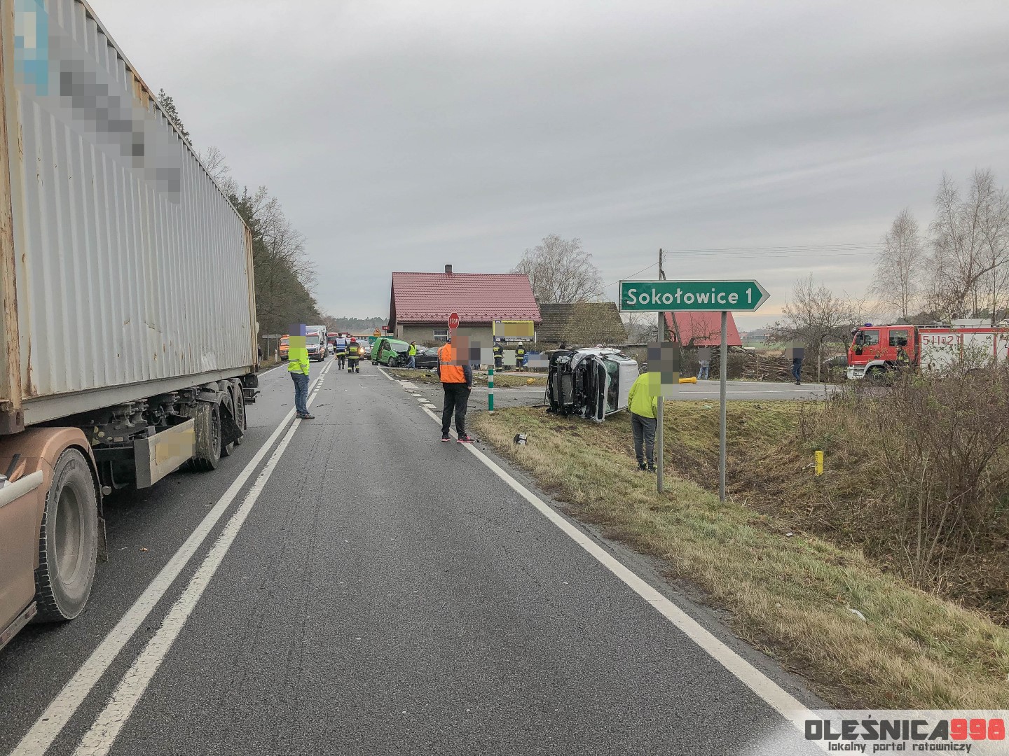 Jak wynika z naszych informacji, do zdarzenia miało dojść podczas gdy Volkswagen Caddy, wyjeżdżał od Sokołowic w kierunku Oleśnicy. To wtedy, kierujący Hyundaiem Tucsonem miał wyprzedzać, w miejscu niedozwolonym, poruszający się w kierunku Międzyborza pojazd ciężarowy. Hyundai, próbując się ratować od kolizji z VW odbił się od ciężarówki a następnie, mimo wszystko, zderzył się z Volkswagenem, który następnie siłą uderzenia obrócił się i uszkodził stojącego za nim Mercedesa. Po zderzeniu z zielonym „dostawczakiem”, Hyundai wjechał na trawiastą wysepkę a następnie przewrócił się na bok.